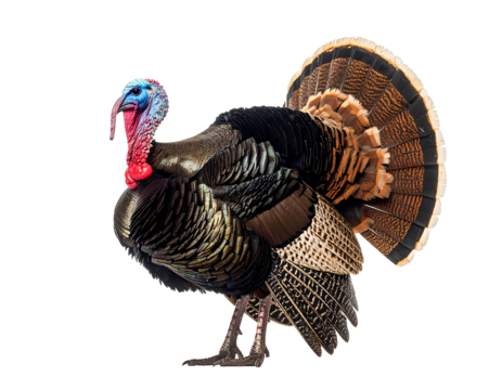 Magnificent turkey with iridescent metallic feathers and a full fanned tail.
