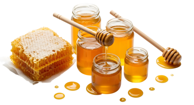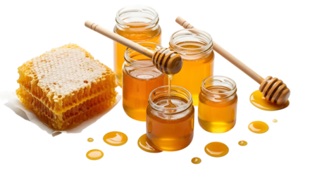 Honeycomb and jars of honey display on transparent background