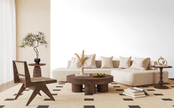 Scandinavian Modern Sofa with Decorative Cushions and Wooden Coffee Table in Living Room - PNG Transparent Background with Shadow – Transparent Wall Mockup with Realistic Shadows – 3D render