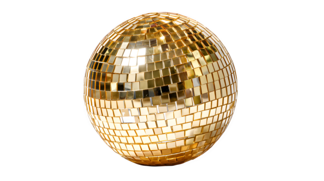 A shiny golden disco ball isolated on a white background creates a bright reflection of light, serving as a glittery mirrorball sphere for party decorations and nightlife club dance celebrations