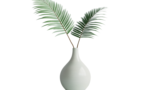 Tropical palm leaf in ceramic vase, minimal design, high-resolution and clean cut, PNG on white