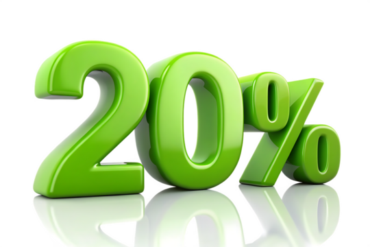 Shiny green 3d twenty percent symbol with reflection on black background isolated on a transparent background