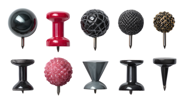 Colorful push pin set. Pushpin for notice paper or corkboard. Notice board pins. 3d illustration icon isolated on transparent background, png