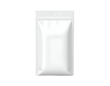 Blank white rectangular foil packet mockup for candy, biscuit, or small snack. Sealed flow pack wrapper template for food product packaging design. Isolated on transparent background, png