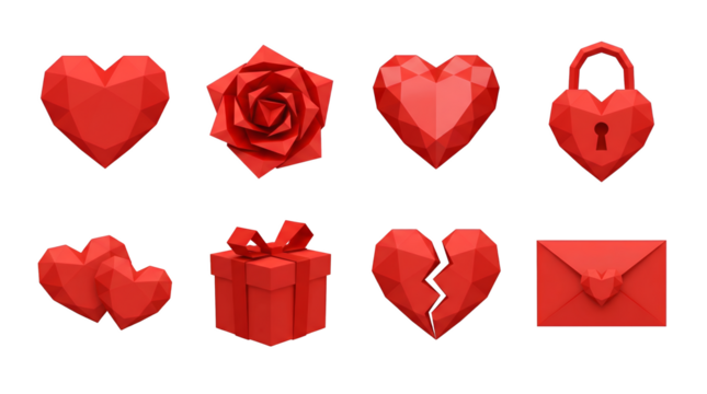 Valentine's day romantic icon set including heart, rose, gift box, key, envelope, tulips, cupcake, and gemstone isolated. Love and anniversary celebration collection.