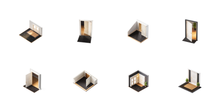Collection of isometric entryways featuring various door styles and floor mats presented on transparent background
