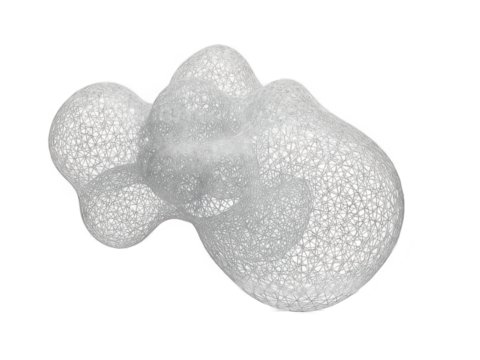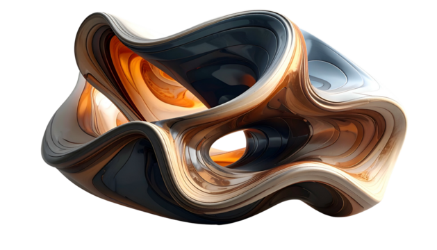 Glossy, abstract, flowing 3D sculpture with layered, curving surfaces and a dark void