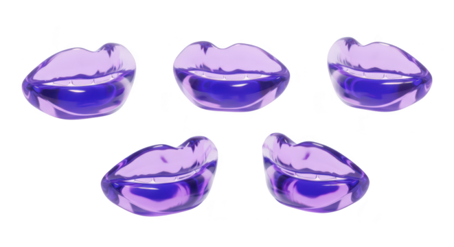 Floating 3D purple lip sculptures on a white background casting shadows ideal for cosmetic or beauty promotion
