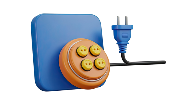 Abstract 3D rendering of a blue tablet with orange button interface and plug