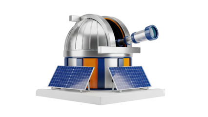 A detailed 3d rendering of a modern satellite with extended solar panels and communication antennas is shown floating in the vast expanse of