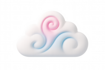 White cloud computing icon with pink and blue swirls floating on a transparent background, ideal for technology and weather-related designs
