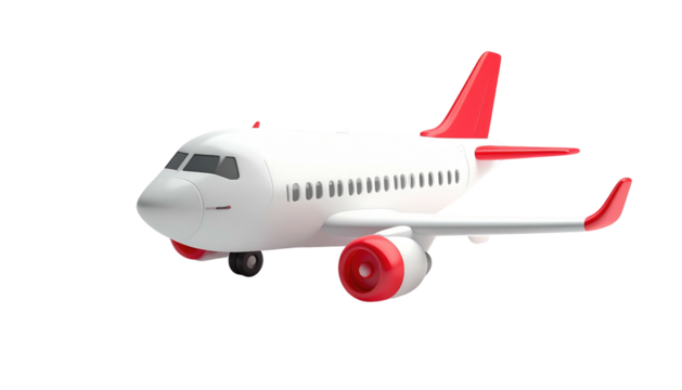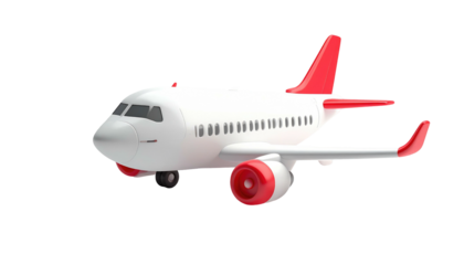 White airplane with red accents rendered against a black background. 3D graphic of a flying machine