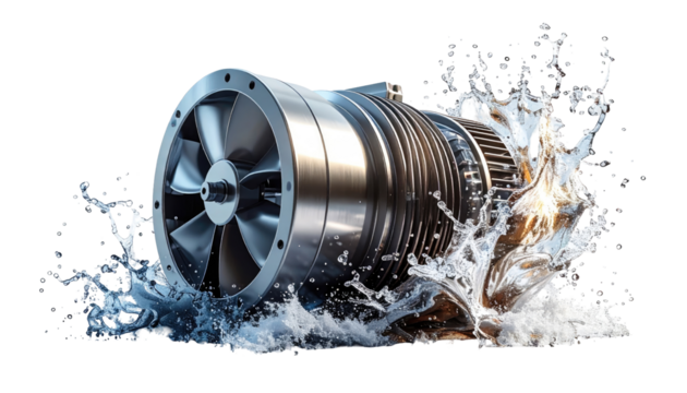 A 3D render of a concrete water treatment basin with a submerged pump or turbine and central pillar, set against a transparent background. background removed