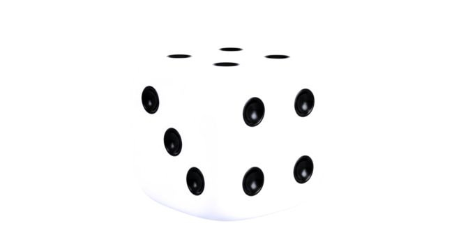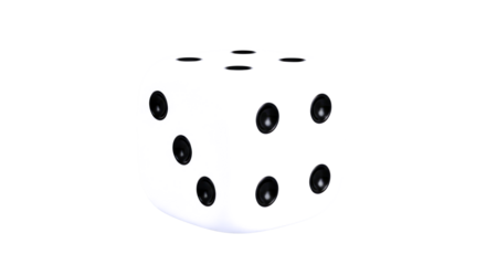 suspenseful 3d model of a white die perfect for game design, animation, and graphic design projects, conveying chance and fate, isolated on transparent background