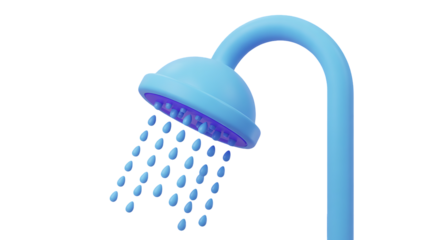 A 3d rendering showcases a blue shower head with water droplets cascading down, creating a refreshing and clean aesthetic, isolated on transparent background