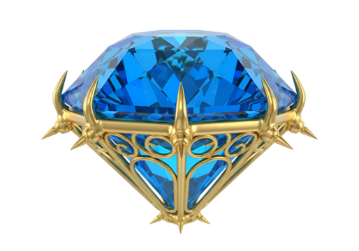 A dazzling, vibrant blue diamond set in an ornate, golden frame with sharp spikes, showcasing a regal and powerful aesthetic against a dark backdrop.