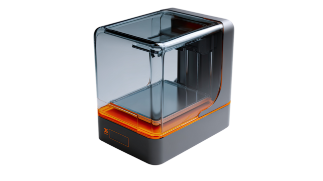 3D Printer, modern, enclosed, transparent, gray, orange accents, cube-shaped, printing platform,  printing chamber
