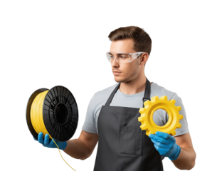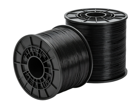 Two spools, one angled, of tightly wound black filament against a stark black backdrop