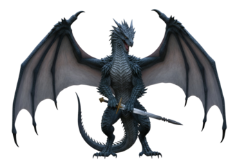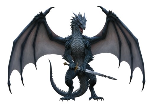 A majestic, gray-scaled dragon, wings outstretched, stands proudly holding a sword against a black backdrop.