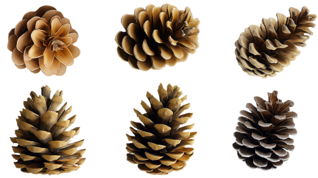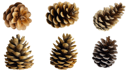 Collection of 6 pine cones in 3x2 grid, varying in size and shape. Brown colored pine cones, some darker. Macro close-up of pine cone set, isolated on isolated transparent background. Alpha mask.