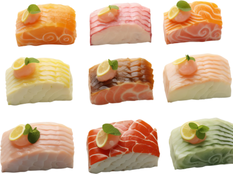 Close-up of assorted sushi pieces topped with various fresh ingredients and garnishes, arranged in a neat 3x3 grid on a white background.