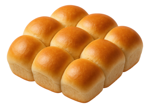 A batch of nine golden brown dinner rolls arranged in a 3x3 pattern, showcasing their soft and fluffy texture.