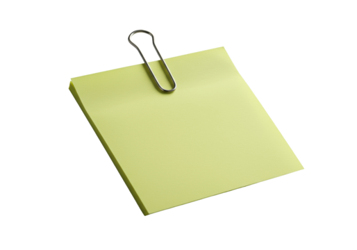 Pristine blank yellow 3x3 sticky note with clean sharp edges and a minimalist silver paper clip attached, on an immaculate light grey surface with negative space, high-key studio photo, crisp focus,