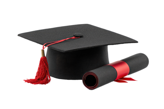 Graduation cap and rolled diploma tied with ribbon, clean studio look, isolated on transparent background --ar 4:3 --v 7.0 --p 537mr6h --s 250