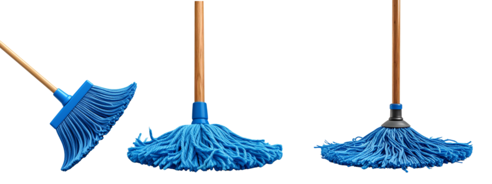 Transparent Background 3 Blue String Mop with Wooden Handle Standing Upright, Front View,