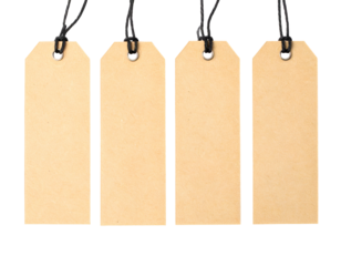 Four brown rectangular tags with black string hanging against a black background, isolated