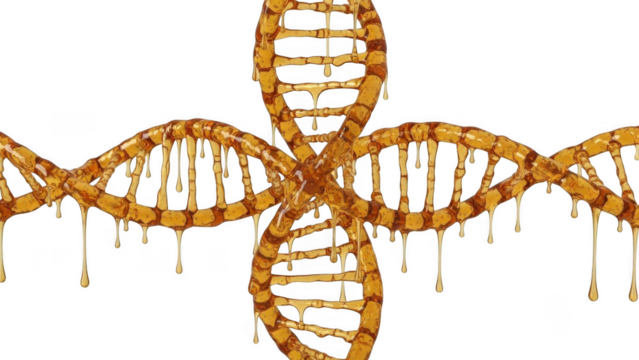Honeycomb textured D N A double helix structure dripping golden liquid isolated on a transparent background