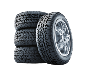 Two car tires with shiny alloy rims isolated on transparent background. Stack of new tires brand new tires isolated on white background.