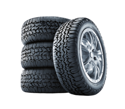 Four tires stacked, showing tread patterns and wheel rims.  A gray-toned, studio shot, isolated against a black background