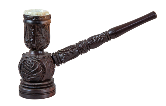 Ornate wooden smoking pipe with floral carvings and stone bowl on white background