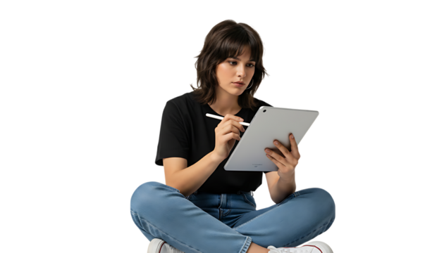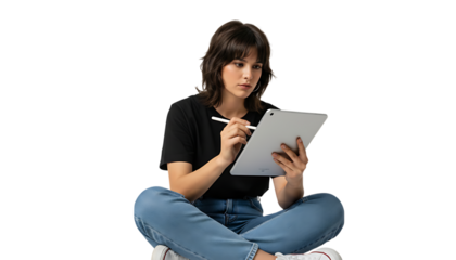 Woman sitting using tablet with stylus on black studio background video 4k