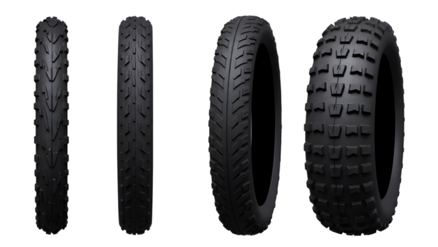 Four different motorcycle tires showing tread patterns isolated on transparent background
