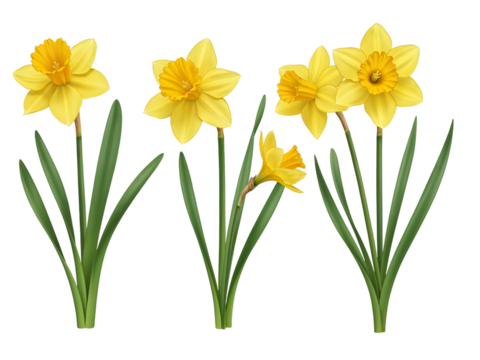 A cluster of five bright yellow daffodils with green leaves isolated on transparent background