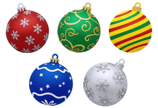 A set of five colorful and festive Christmas ornaments, including red, green, blue, silver, and yellow, isolated on a white background. A vibrant holiday collection.