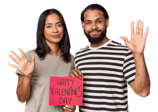 Latina couple with Valentine's sign smiling cheerful showing number five with fingers.