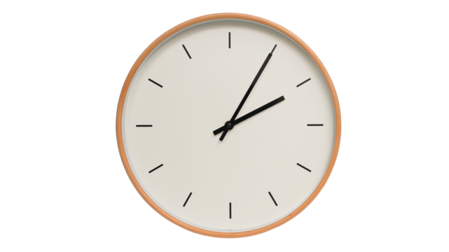 Isolated on white background Minimalist style wooden wall clock, showing time at  01.05 or 13.05 - Perfect for Time Management and Scheduling Concepts