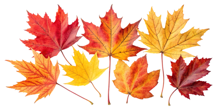 Five maple leaves with fall colors creating a beautiful autumnal display on a transparent background