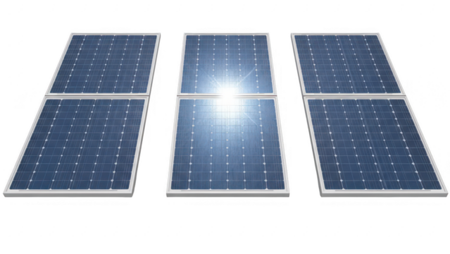 Array of five solar panels installed outdoors on a sunny day, renewable energy technology for sustainable power generation isolated on transparent background
