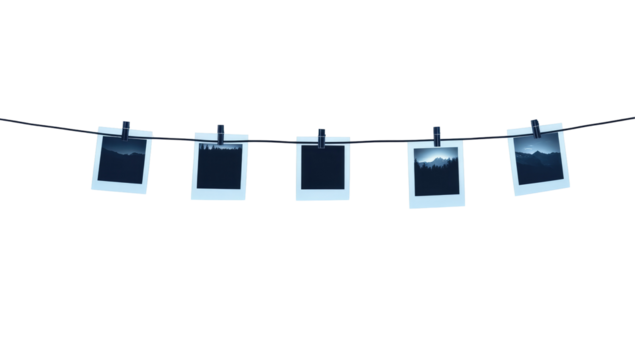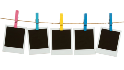 A row of five Polaroid frames pinned on a rope with clothespins, showcasing simplicity and an anticipation of cherished memories, isolated on white or transparent background. PNG
