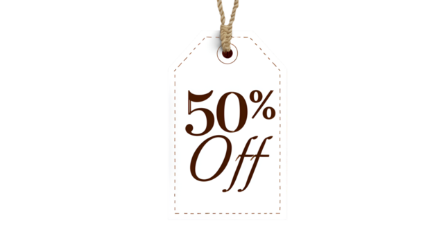 A price tag with bold 50 percent off text isolated on transparent background for discount promotion design