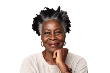 Happy middle aged mature black woman, senior older 50 year lady looking at camera touching her face isolated on white close up face portrait PNG
