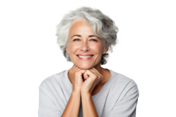 Happy middle aged mature asian woman, senior older 50 year lady looking at camera touching her face isolated on white close up face portrait PNG