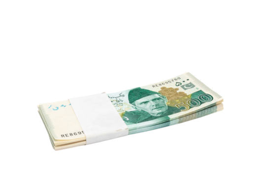 Pakistani five hundred rupees banknote bundle on white isolated background