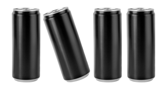 Black aluminum beverage can mockup standing, blank metal soda drink packaging with transparent background