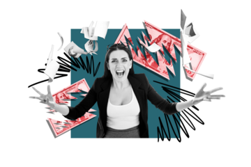 Composite photo collage of angry businesswoman scream work failure bankrupt torn money usd inflation isolated on painted background