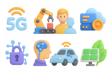 Colorful 3d icons of 5g technology, automation, and renewable energy